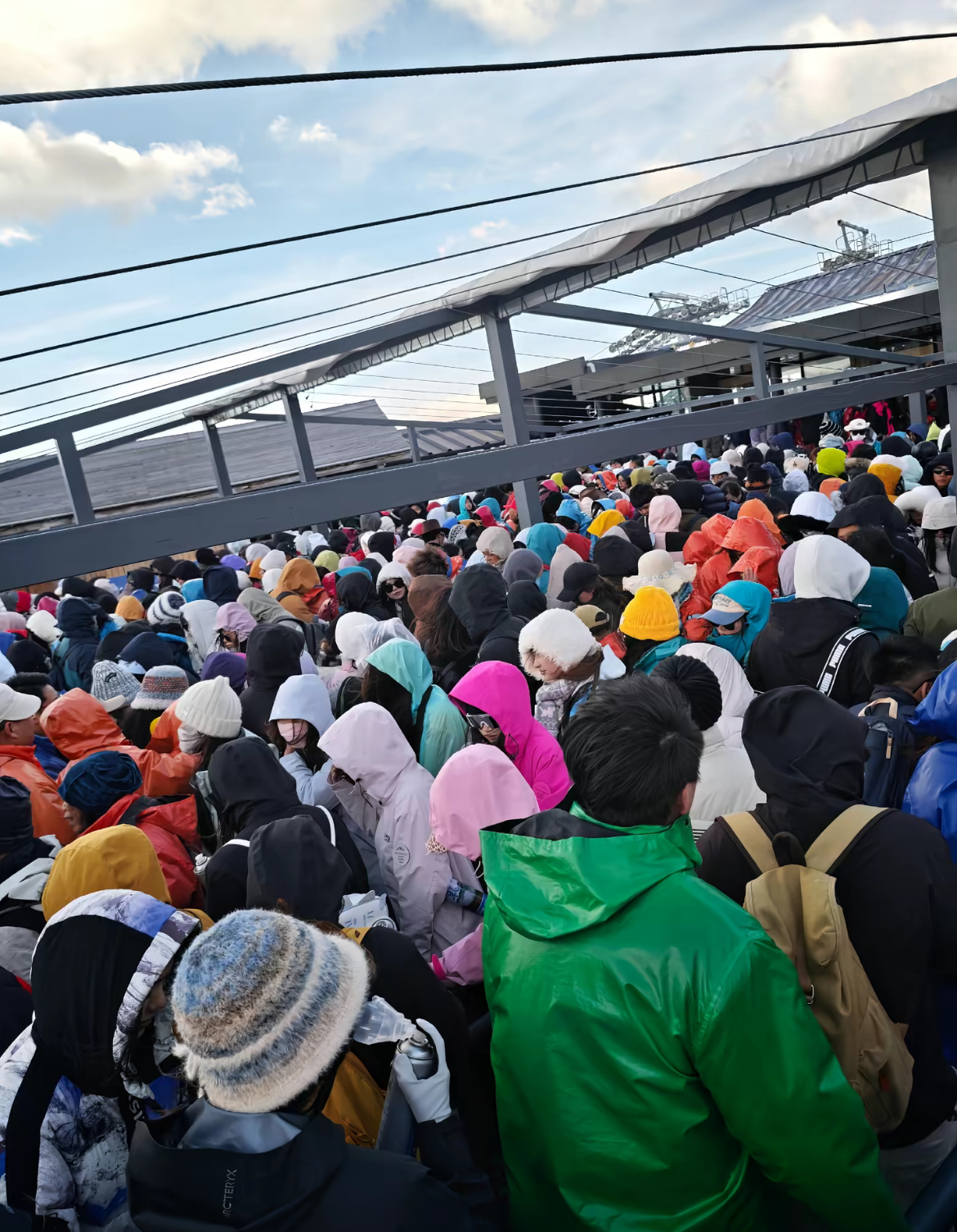 排队进度还算快,每十分钟能往前走一到两米,但是现场人太多了,20点多小李才进了候车大厅。因为长时间处于海拔4600米的山顶,小李开始感到缺氧和身体不适,她找了地方坐下来休息。过了一会儿才有工作人员送上氧气瓶、小零食和糖果,还有热心游客自发组织起来送氧气瓶、食物和水,让身体不适的游客先行下山。直到22点半小李才坐上缆车,工作人员在缆车里装了沙袋,缆车并不摇晃,最后直到次日凌晨她才回到丽江的酒店。
